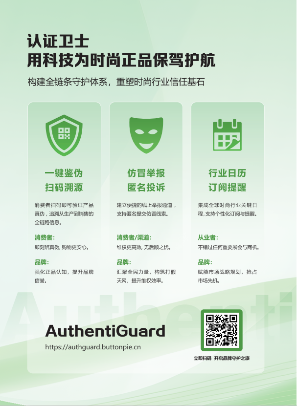 对于渴望拓展国际市场的独立设计师品牌、新锐时尚企业及成熟品牌而言,AuthentiGuard不仅是守护品牌价值的“防伪盾牌”,更是链接全球渠道、整合行业资源、实现跨越式增长的“战略通行证”。它帮助品牌在复杂的全球市场环境中建立差异化竞争优势,让消费者的每一次购买都成为对品牌信任的投票。